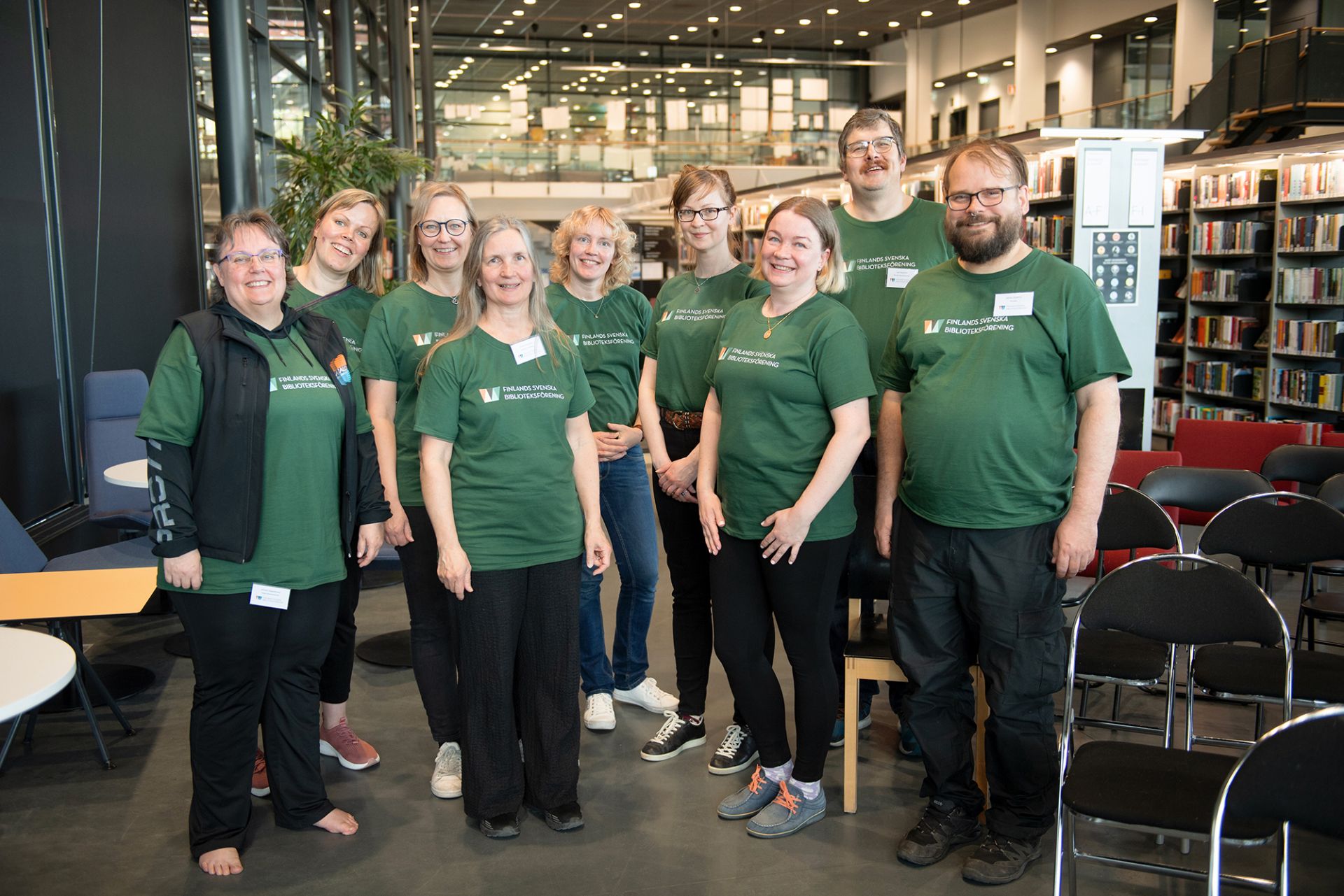 Den avgående styrelsen samlad i Borgå stadsbibliotek, fr.v. Anneli Haapaharju, Michelle Mattfolk (verksamhetskoordinator), Teresa Westmark, Anne Granberg, Monica Sandström, Emma Ekstrand, Mia Karvonen, Jan Nyström och Janne Nyström. Alla utom Monica Sandström ingår i nya styrelsen tillsammans med de nya styrelsemedlemmarna Ulrika Staffans, Ulrika Backlund och Charlotta Panzera. På bilden saknas Sara Söderbacka som liksom Sandström avgick i och med årsmötet.