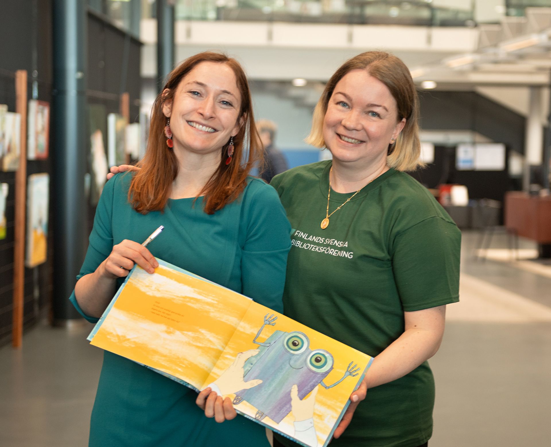 Linda Bondestam medverkade som överraskningsgäst! Hon berättade om processen bakom sin senaste bok Chop chop. - Man ska verkligen inte tro att man måste vara den bästa tecknaren för att göra bilderbokskonst utan det handlar om hur man berättar en historia. Man kan vara rädd för att misslyckas, men konst kan göras på många sätt, förmedlade Linda. Här tillsammans med avgående ordförande Mia Karvonen.